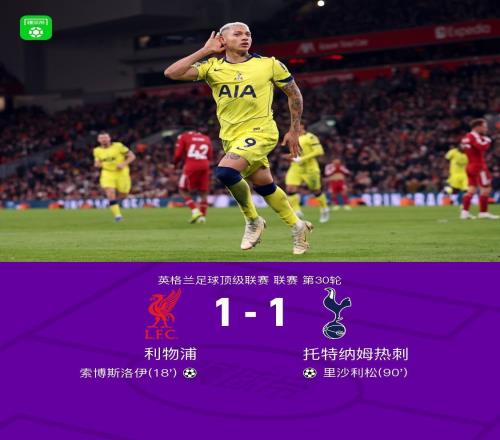 里沙利松90分钟绝平,热刺11利物浦终结6连败,送斯洛特耻辱纪录