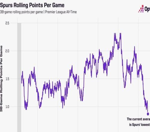 热刺近38场联赛场均0.87分,为队史任何一段38场比赛中最少