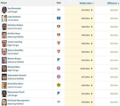 德甲球员身价涨幅榜:迪奥曼德3000万欧居首,武什科维奇第二