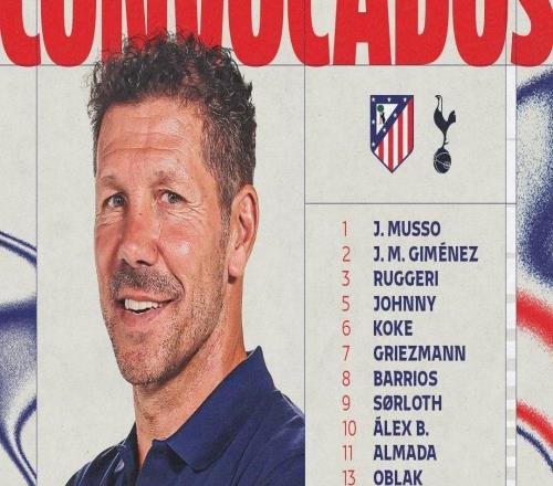 马竞主场战热刺大名单:格列兹曼、阿尔瓦雷斯、卢克曼在列
