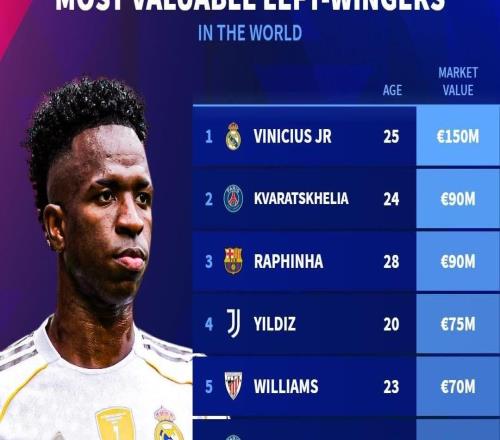 德转列左边锋身价榜:维尼修斯1.5亿欧居首,KK第二