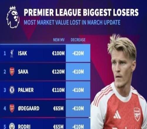 英超身价跌幅榜:伊萨克下跌2000万欧,萨卡、帕尔默下跌1000万欧