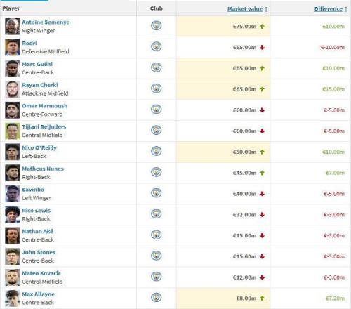 曼城14人身价变更:谢尔基1500万欧涨幅最大,罗德里跌1000万