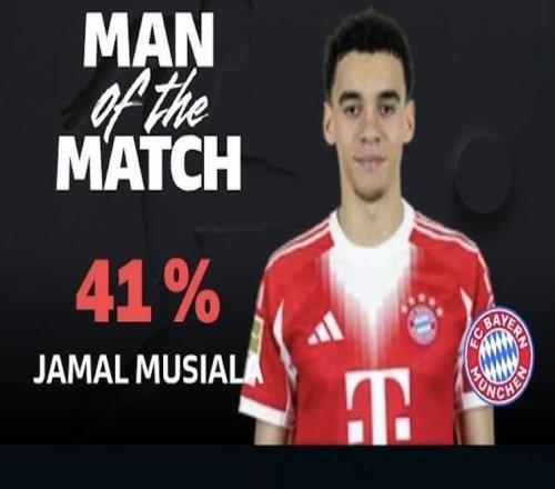 点射破门,穆西亚拉当选拜仁vs门兴全场最佳球员