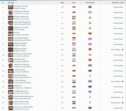 英超身价更新:哈兰德2亿欧居首,萨卡降至1.2亿欧,索博涨至1亿欧