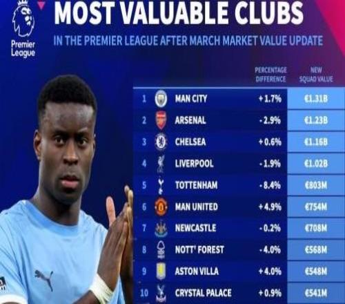 英超球队身价榜:曼城第一阿森纳第二,热刺跌幅8.4%最大