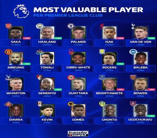 英超各队德转身价最高球员:哈兰德2亿第1,尼奥托2000万最低
