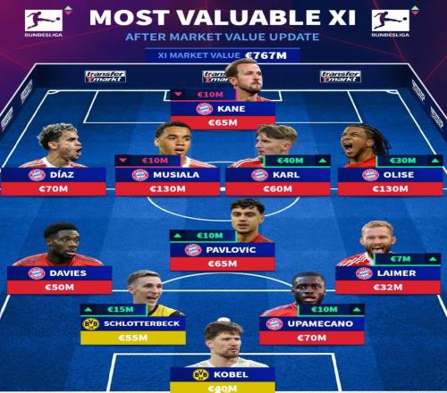 德转德甲最贵阵:拜仁9人多特2人,奥利塞、穆西亚拉1.3亿领衔