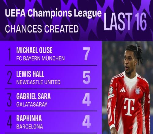 与亚特兰大一役奥利塞创造7次机会,刷新欧冠生涯单场纪录