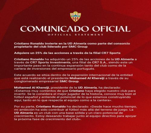 C罗官宣!收购阿尔梅里亚25%股份,离开皇马8年后重返西班牙