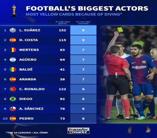 假摔能拿黄牌的天才们苏牙和科斯塔联手夺冠C罗也勉强挤进前十_西甲直播