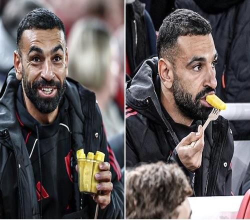 神态轻松,对水晶宫比赛未进入大名单的萨拉赫被拍到在场边吃菠萝