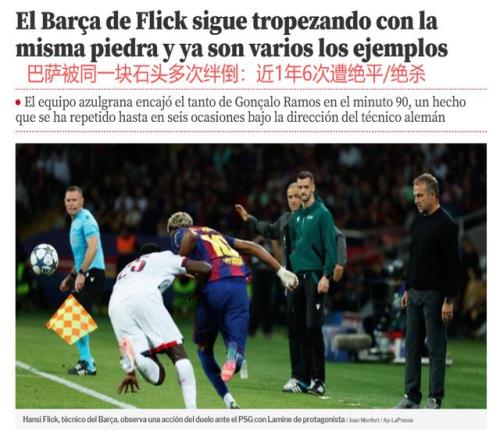 巴萨vs巴黎的焦点大战,第90分钟,阿什拉夫助攻贡萨洛-拉莫斯,巴黎上演绝杀好戏。1分变0分,巴萨主帅弗里克很失望。赛后。弗里克指出:“1-1的比分,我们应该保持90分钟的专注,加强防守,保持阵型的完整。我们必须吸取教训,不能再犯错。”