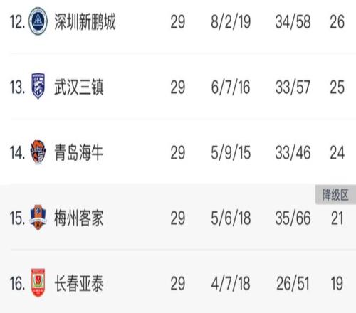 本轮过后,深圳新鹏城、武汉三镇已经提前上岸,而长春亚泰则提前降级。中超最后1个保级席位,将在青岛海牛和梅州客家之间展开。