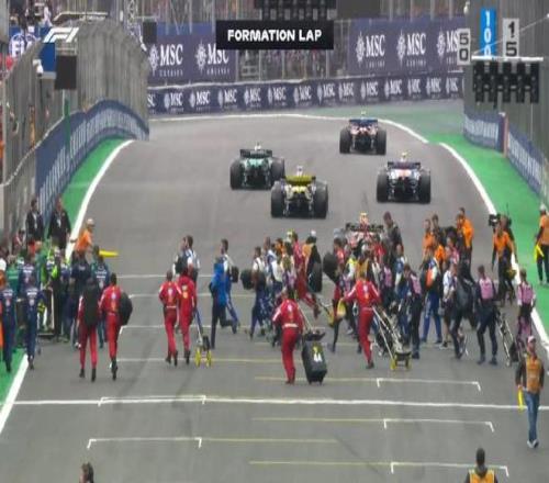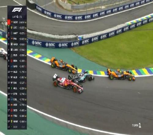 安全车结束后,皮亚斯特里、安东内利、勒克莱尔三车并排,皮亚斯特里碰到安东内利,后者碰到勒克莱尔左前轮,勒克莱尔退赛!
