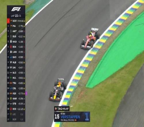 第十五圈:维斯塔潘进站换上中性胎后连续超车已经上升到P13