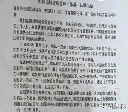 媒体人付政浩发文点评:四川男篮确实到了生死一线、间不容发的地步了。按规定,欠薪超过三个月,篮协有权暂停俱乐部注册直到除名、让球员全部恢复自由身,俱乐部如果丧失CBA参赛权,那大概率就会破产,大家鸡飞蛋打,对球员也是伤害,CBA若因此新赛季只剩19队,赞助商和版权购买方也不排除会要求按场次核减费用,这就是多输局面。