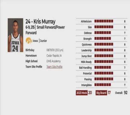 我们看一下2023年他在NBA draft 网站的选秀报告(略有删减),综合评分92分,在防守、强壮度、持球、无形资产方面评分较低,预计选秀顺位17-20顺位(实际第23顺位),选秀模板多里安-芬尼-史密斯。