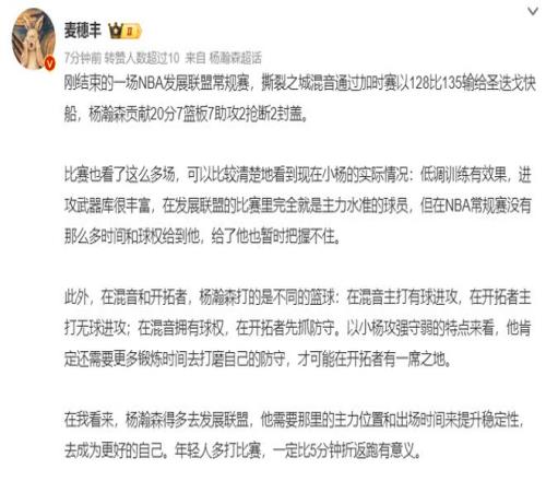 麦穗丰:杨瀚森在开拓者与混音是打不同篮球,战术地位完全不同,混音有能持球进攻,开拓者只能打无球,杨瀚森有球权才能显现自己的才华,他本来就是攻强守弱的特点,他需要更多时间去打磨防守,杨瀚森就该多去G联赛打球,在那里有主力地位、稳定登场时间,比在NBA折返跑有意义。