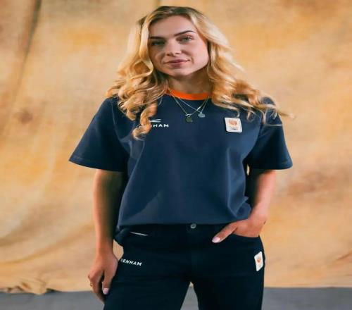 开幕式造型是一件羊毛犬牙纹大衣,内搭一件羊毛混纺高领毛衣,毛衣上饰有凸起的条纹和英国国旗图案,下身是饰有同色系英国国旗织带的运动裤,整体搭配着超大围巾和红白蓝三色鞋带的冬靴。闭幕式上,造型转变为宽松版型,运动员将身穿厚实的羊毛混纺针织运动外套,内搭一件海军蓝和米白色高领打底衫。
