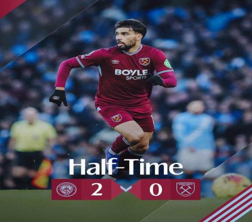 此役客场对阵曼城,上半场战罢,西汉姆联0-2落后,哈兰德和谢尔基各入一球。