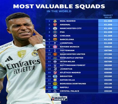 在这一排行榜上,皇马以13.88亿欧元排名榜首,也成为唯一一支身价超过13亿的球队。其中,皇马拥有姆巴佩、贝林厄姆、维尼修斯、巴尔韦德4名身价过亿的球员。