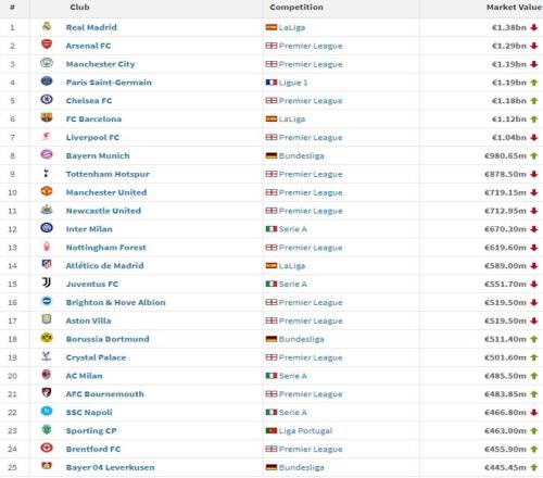 周三,《转会市场》公布2025年全世界身价最高的100支足球球队,皇马以13.8亿欧元排名榜首,阿森纳、曼城分别排名第2、3位。