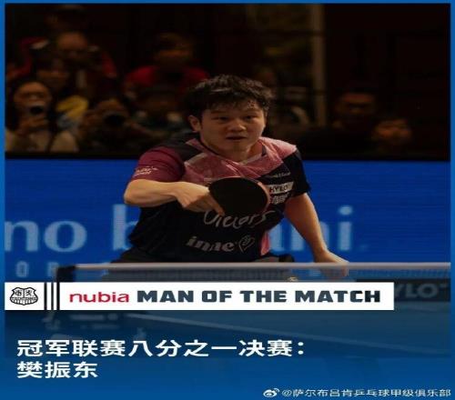 本场比赛樊振东率先出战,直落三盘以11-1、11-5、11-5击败霍多尔斯基,取得个人职业生涯欧冠首胜,最终带队击败对手挺进下一轮,四分之一决赛将对阵德国格伦韦特斯巴赫队与法国埃讷邦队之间的胜者。