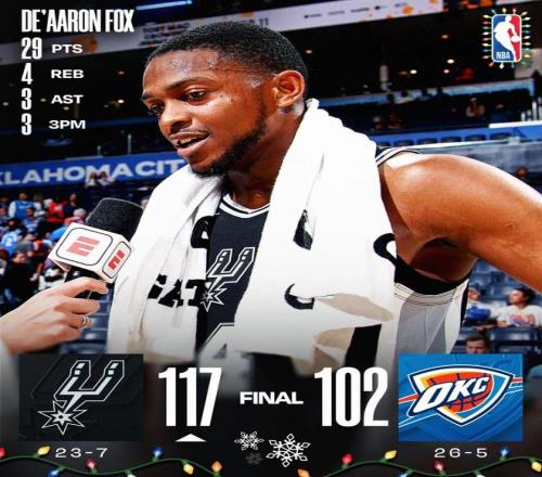 ——两队第一次交手在NBA杯半决赛,那场马刺最多落后16分,文班亚马替补成为奇兵(只打了20分钟,拿了22分9篮板2助攻,正负值+21),马刺111-109险胜雷霆2分