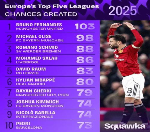 据统计,2025年欧洲五大联赛“创造机会次数”排行榜出炉。曼联中场布鲁诺-费尔南德斯以103次强势领跑,拜仁边锋奥利塞以98次位列第二。