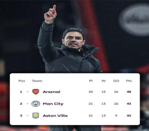 英超第21轮,排名第二、第三的曼城和维拉双双丢分,这意味着领头羊阿森纳有望在本轮过后将榜首领先优势扩大至8分。