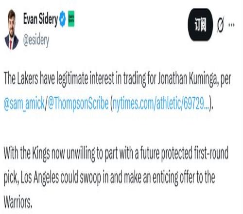 名记Sidery随后表示,鉴于国王队目前不愿为库明加送出未来受保护的首轮签,湖人队或许会趁机介入,向勇士队开出一份更诱人的报价。