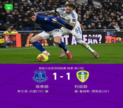 北京时间1月27日,英格兰足球超级联赛第23轮,埃弗顿主场对阵利兹联。利兹联由詹姆斯-贾斯廷破门得分,埃弗顿随后由蒂尔诺-巴里破门扳平。最终双方以1比1战平。