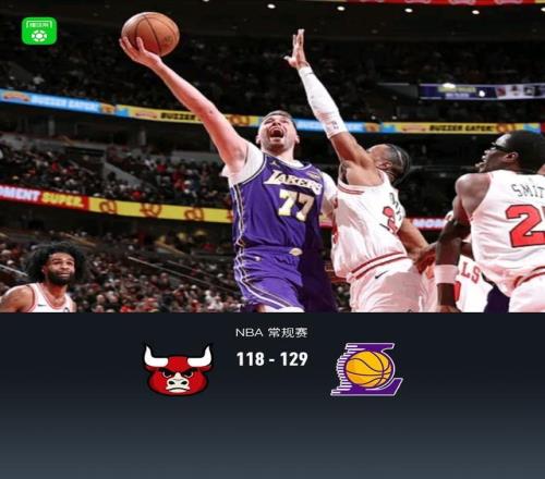 第四节,开节公牛基迪领衔连续反击追至10分,节中多森姆连续反击冲框一度追至7分,随后湖人东契奇连中三分稳住局面再度拉大至两位数,随着海斯、詹姆斯相继得分,比赛逐渐失去悬念,全场结束,湖人129-118公牛。