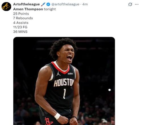 此役阿门-汤普森全场比赛36分钟,23中11,罚球3中3,拿到火箭最高的25分外加7分4篮板4抢断1盖帽,命中率47.8%,整个第四节7中1拿2分,他出手是火箭最多。