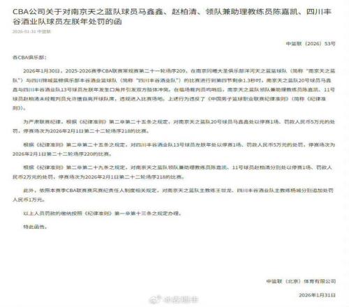 CBA公司发布公告,因临近比赛结束时发生冲突,同曦男篮球员马鑫鑫被停赛1场且罚款人民币5万元;四川男篮球员左朕年被停赛1场且罚款人民币5万元;同曦男篮领队兼助教陈嘉凯、球员赵柏清分别被停赛1场且罚款人民币2万元;依照本赛季CBA联赛赛风赛纪责任人制度相关规定,同曦男篮主教练王世龙、四川男篮主教练杨城分别被追加处罚人民币1万元。