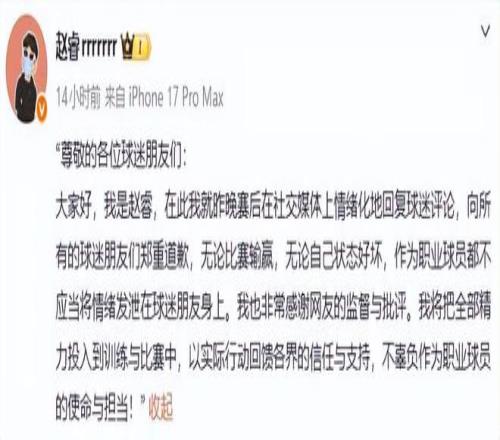 第二条消息来自于赵睿,2月2日晚间他在网上发出道歉信,对于输给青岛队赛后回复网友的不理性言论道歉。