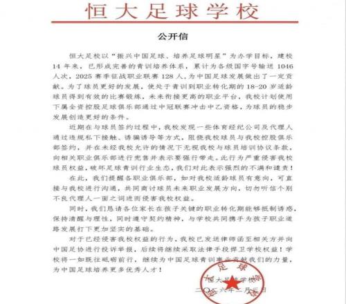 拒绝为他人做嫁衣裳!日前,恒大足校罕见公开发文谴责这种现象(上图)。表示有些体育经纪公司私底下挖角这些U17青训精英,损害了恒大足校的利益和青训生态。