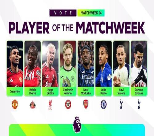 北京时间2月3日,英超官方公布了第24轮比赛的最佳球员候选名单,其中卡塞米罗、埃基蒂克、马杜埃凯、若昂-佩德罗、哈维-西蒙斯、索兰克等球员在列。