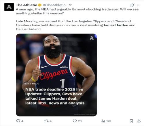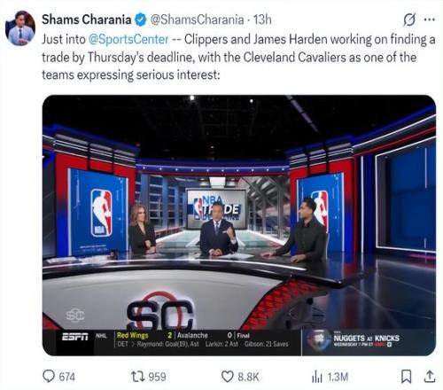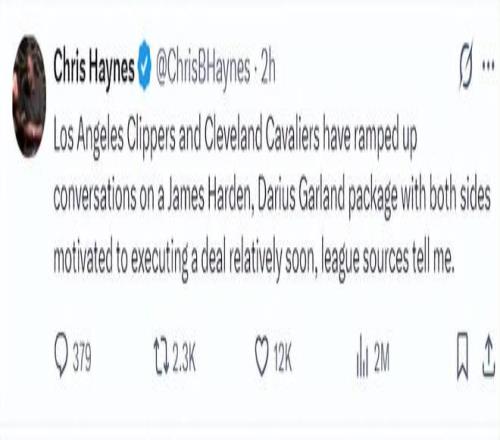 根据NBA记者克里斯-海恩斯的报道,快船、骑士两队的沟通正在加速,哈登换加兰的谈判有条不紊的进行,双方都希望能促成这笔交易。