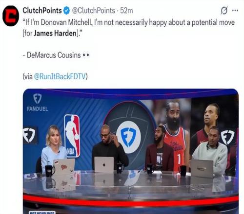 在最新的FDTV节目中,前NBA球员考辛斯谈到骑士、快船关于哈登、加兰的交易,他说道:如果我是多诺万-米切尔,我会很高兴球队可以交易来詹姆斯-哈登。