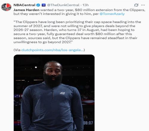根据快船记者Tomer Azarly的报道,哈登原本希望给快船签下一份两年8000万的完全保障合同,但快船不愿意答应他的请求,快船队一直将球队2027年夏天的薪资空间座位工作重点,不愿意给球员超过26-27赛季的合同。