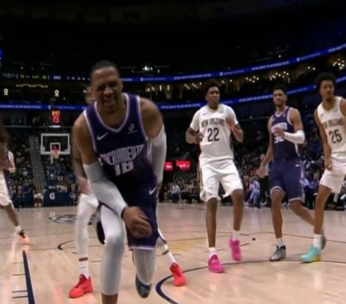 易边再战,锡安连续突破得手一人连拿6分,特雷-墨菲三分连中,鹈鹕领先国王多达21分。阿丘瓦上篮不中,威少冲刺跟进收下前场板并顺势完成隔人补扣,开心笑了。威少强突不慎踩到对手脚背明显崴脚,表情痛苦,但好在并无大碍,鹈鹕竟然选择挑战,最终失败血亏还送两次罚球。卡特失误,墨菲三世抢断后助攻菲尔斯完成快攻得分,米西再暴扣打成2+1,鹈鹕打出一波17-2超级攻击波,已经领先国王到30分。