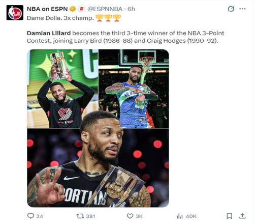 利拉德拿到三个三分大赛的冠军后他也成为NBA历史第三人,比肩1986-88赛季的拉里-伯德与1990-92赛季的霍奇斯。