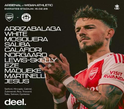 阿森纳首发:13-凯帕、4-本-怀特、3-莫斯克拉、2-萨利巴、33-卡拉菲奥里、16-内尔高、49-斯凯利、10-埃泽、20-马杜埃凯、11-马丁内利、9-热苏斯