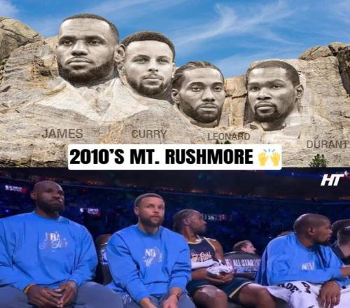 凯文-杜兰特在全明星周末唯一的正面报道,可能就是这张图,被誉为是21世纪的‘总统山’,詹姆斯、库里、伦纳德、杜兰特,这四人12次总冠军,7次MVP,9次FMVP。