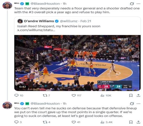 休媒:火箭队很需要一位防守型中锋与一个投手,一年前他们用探花签选中了投手,可关键时刻却不让谢泼德登场。你总是说谢泼德防守端表现糟糕,可我们此役是输在进攻端,单节丢33分还考虑防守吗?至少让球队在进攻端有所作为吧。