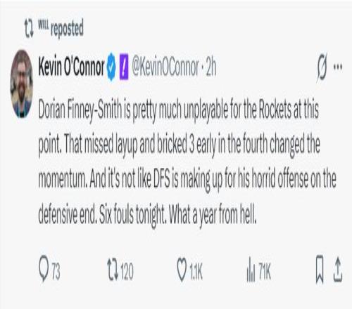 NBA记者凯文-奥康纳质疑乌度卡的用人:芬尼史密斯在火箭队根本无法发挥应有水准,第四节丢上篮、多次投丢空位三分还有低级失误,他防守端的特点也没有展现出来,全场还吃下6次犯规。