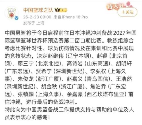 北京时间2月26日18:00,中国男篮将在客场对阵日本,最终的12人名单会在赛前产生。3月1日16:00,中国男篮对阵中国台北。