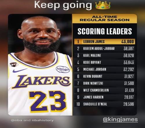 在2023年2月7日湖人对阵雷霆的比赛中,他砍下38分,超越卡里姆-阿卜杜勒-贾巴尔,登上常规赛生涯得分榜榜首。詹姆斯在2025年12月30日年满41岁,目前独自一人高居历史得分榜榜首。